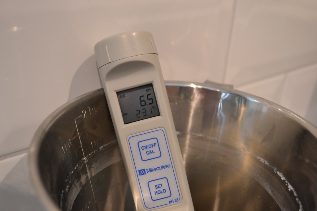 Kalibrering av denna pH-mätare, en Milwaukee pH 55 var förhållandevis enkel och även om det medföljde bra instruktioner så gav den i princip även dessa själv. Knappen för kalibrering hålls in till displayen visar ”CAL”, därefter placeras den i buffertvätskan tills displayen visar att den är klar, den placeras i nästa (om man tvåpunktskalibrerar) och när även den delen är klar återgår mätaren till normalläge.