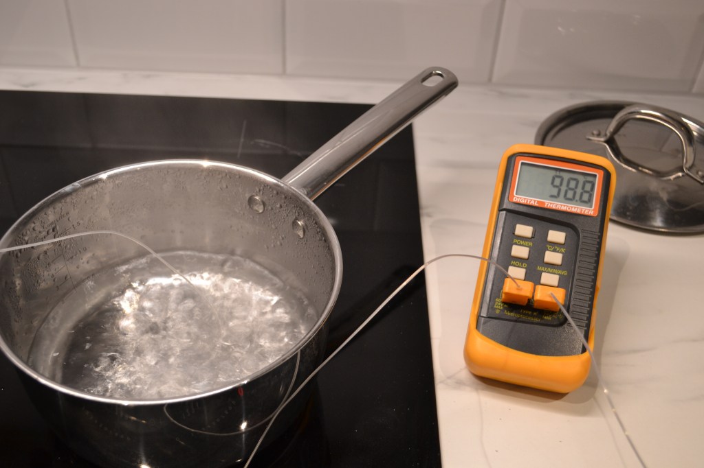 För en tid sedan köpte jag en ny, billigare termometer från Kina. Innan jag ska börja använda den i skarpt läge, och rätta mig efter vad den visar behövde jag ta reda på hur väl den stämmer. Enligt specifikationen har den en noggrannhet på 0,5 grader. För att se hur väl den överensstämde behövdes en känd temperatur att jämföra emot, och där är kokande vatten det som finns närmast till hands. Vid kokning på spisen så försök hålla temperaturgivaren någon centimeter från botten, håller man den för högt blir värdet för lågt och ligger den mot botten så är temperaturen högre. På bilden nedan höll jag exempelvis min lite för högt.