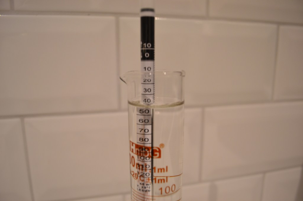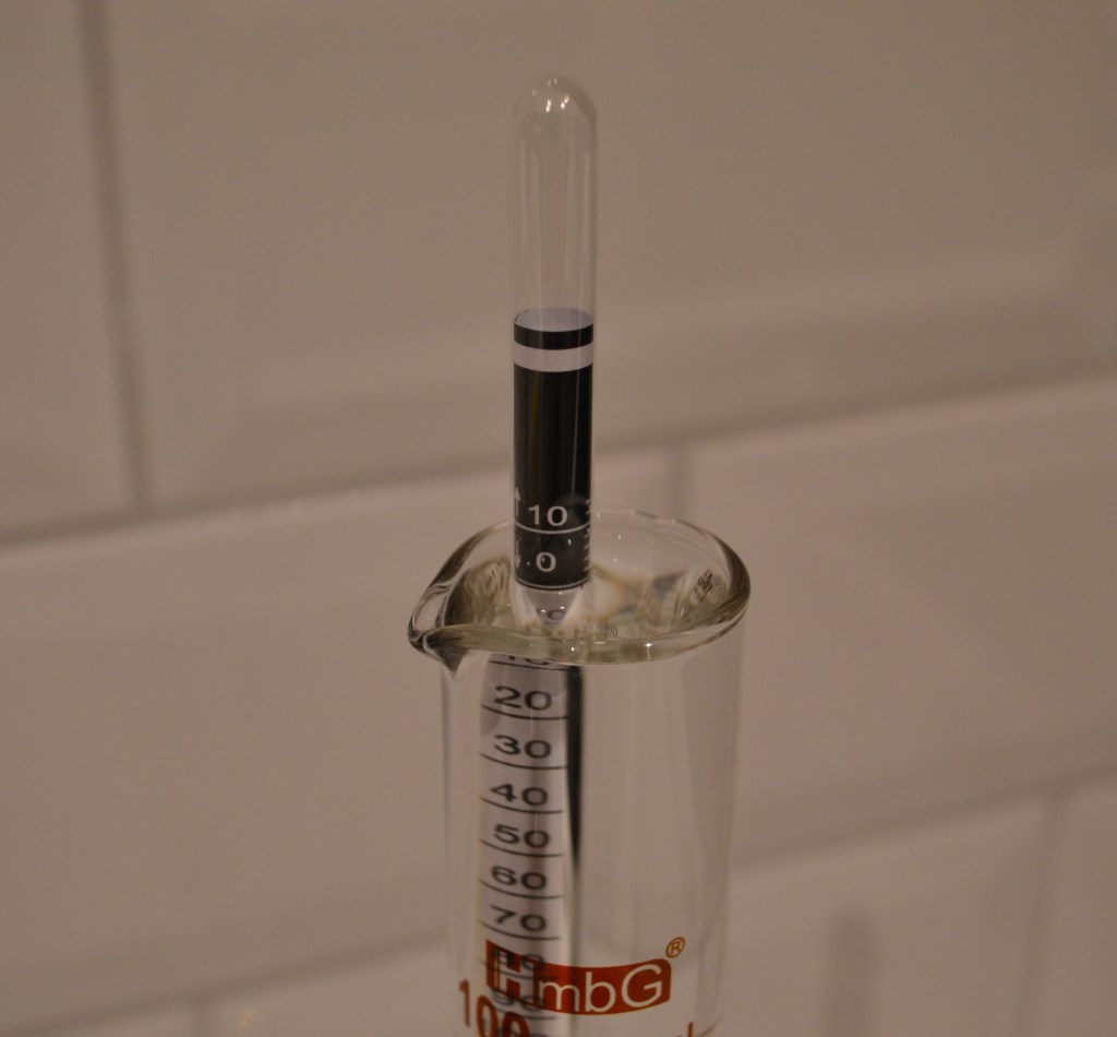 Mina hydrometrar stämde väl överens med båda referenspunkterna utan några justeringar. Med dess föregångare tidigare har jag fått göra vissa justeringar. Mätinstrumentet använder Arkimedes princip och värdet är följaktligen beroende av hydrometerns vikt. Det innebär att i de fall då den visar ett för högt värde så väger den för lite och det kan åtgärdas med lite tejp som extra tyngd på toppen. Visar den å andra sidan ett för lågt värde väger den för mycket och får justeras genom att en del av ”glasdroppen” i botten filas bort med en fin fil.