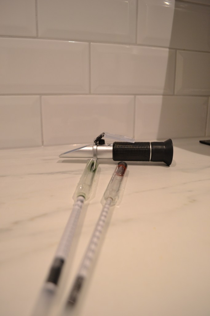 Båda mina hydrometrar är hyfsat nyinköpta och har inte genomgått någon noggrannare kalibrering. Endast en enkel kontroll med kranvatten vid 20 grader har jag gjort, där de förvisso har visat 0 som sig bör. Refraktometern har genomgått en tvåpunktskalibrering, men för ett bra tag sedan. Förfarandet med tvåpunktskalibrering nedan är ursprungligen plockat från Gustav Lindh (länk).