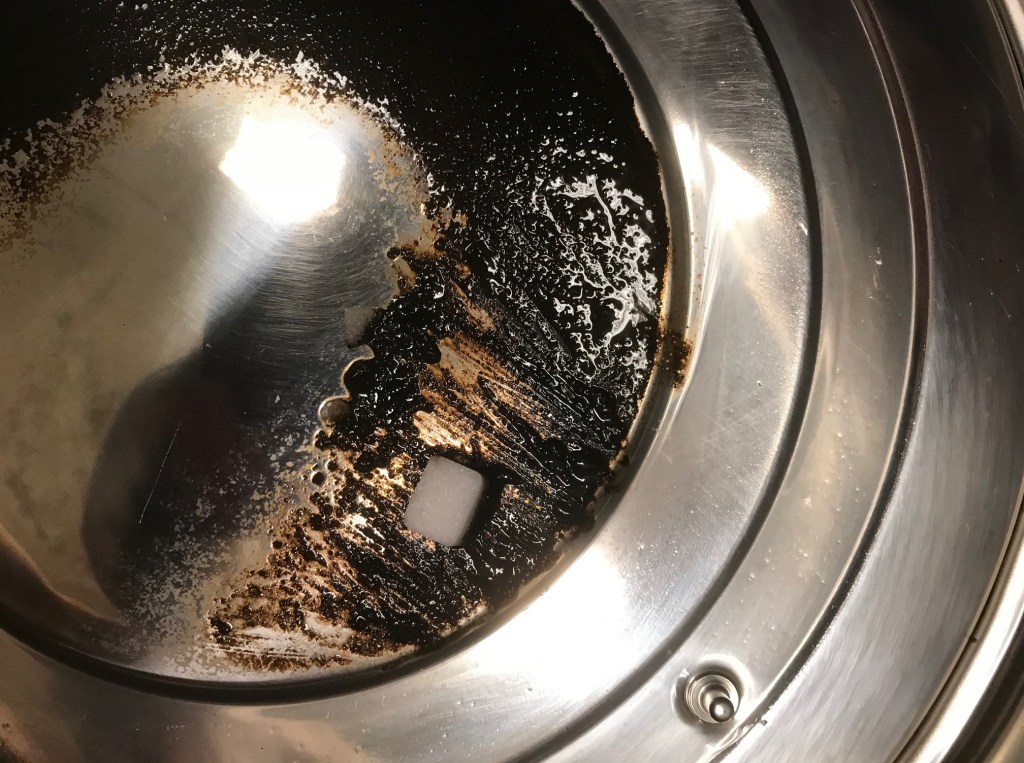 För att få bort det vidbrända, det som sitter riktigt ordentligt, funkar inte någon enkel blötläggning med rengöringsmedel. Det har jag provat och skrubbat mig fördärvad, men utan egentlig effekt. Jag har provat starka rengöringsmedel, men dessa gjorde inte heller någon nytta. Till slut blev jag lite smått desperat eftersom, som jag har snuddat vid i tidigare inlägg, det inte var möjligt att genomföra en ordentlig bryggning när överhettningsskyddet slog till följd av den isolering det vidbrända lagret bildades strax över värmeelementet. Jag hittade ett gammalt husmorsknep som jag knappt trodde skulle fungera, men som ändå var värt att prova efter flera andra fruktlösa försök. Något så enkelt som att gnugga det vidbrända området med en sockerbit. Döm av min förvåning när det faktiskt fungerade, förvånansvärt lätt dessutom. Allt som behövs är ett par sockerbitar och lite vatten. Blötlägg området en liten stund, bara för att ge sockret lite fukt att arbeta med istället för att ”raspa” bort det vidbrända. Därefter är det bara att börja gnugga området i cirkelformade rörelser tills det börjar lösa upp sig och skölja av med vatten.