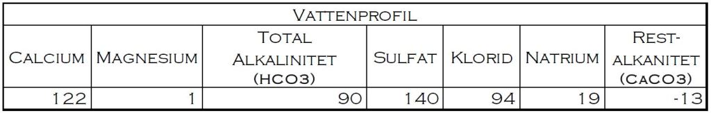 Vattnet justerades även denna gång till profilen härunder. För att nå den lägre rest-alkaniteten till nivå som visas tillsatte jag också 1 ml mjölksyra (80%) i mäskvattnet.