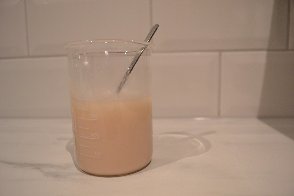 Till min minimäsk ovan tog jag ut en liten del av normalitetslösningen, 10 ml närmare bestämt som jag löste i 90 ml vatten. Det gör att förhållandet milliliter-deciliter kan användas istället för liter enligt tidigare.