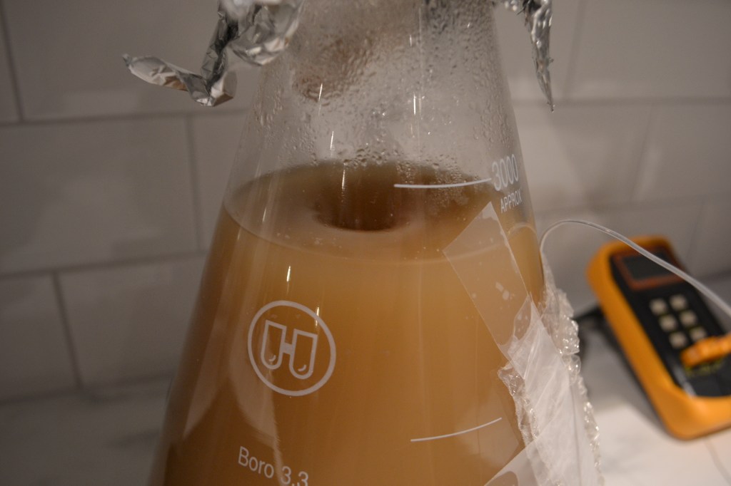 För en jästens tillväxt ligger den optimala vörtstyrkan hos en förkultur i spannet 1.030-1.040 (C. White & J. Zainasheff, Yeast: The Practical Guide to Beer Fermentation). Den vört jag hade sparad sen tidigare låg något högt, på 1.045 och behövde följaktligen spädas före tillredning. Jag har en 3-liters E-kolv där jag tömde ut en del av vörten så att den innehöll 2,5 liter. Genom att fylla på, och späda enligt formeln nedan, med 3 deciliter vatten till en volym av 2,8 liter istället lyckades jag nå en SG av 1.040 ((2,5 * 45)/4 = 2,8).