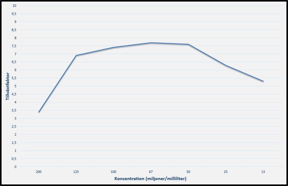 Förkulturens storlek påverkar också jästens tillväxt, eller rättare sagt hur mycket jästceller som tillsätts till en viss volym. Tillväxtfaktorn är ett resultat av denna relation och visualiseras i grafen nedan. Grafen visar mätningar genomförda efter att ett paket flytande jäst, 100 miljarder jästceller, har tillsats vört av varierande volym (C. White & J. Zainasheff). En liten mängd vört i förhållande till jästen som tillsätts ger en liten tillväxtfaktor, och koncentrationen bör inte överstiga 125 miljoner jästceller per milliliter. Motsvarande gäller när koncentrationen understiger 50 miljoner per milliliter, tillväxtfaktorn dalar och man gör snarare öl än en förkultur. Optimalt är således ett förhållande mellan 50-125 miljoner jästceller per milliliter vört. Tillväxtfaktorn ökar avsevärt och kan bli upp till tre gånger så stor när jästen hålls i konstant rörelse, exempelvis vid användning av en magnetomrörare. Det är för att omröringen driver ut koldioxiden som bildas och håller jästen jämnt fördelad i behållaren samtidigt som syre tillförs. Braukaiser skriver om tillväxtens påverkan av konstant omröring och beräkning av densamma här.