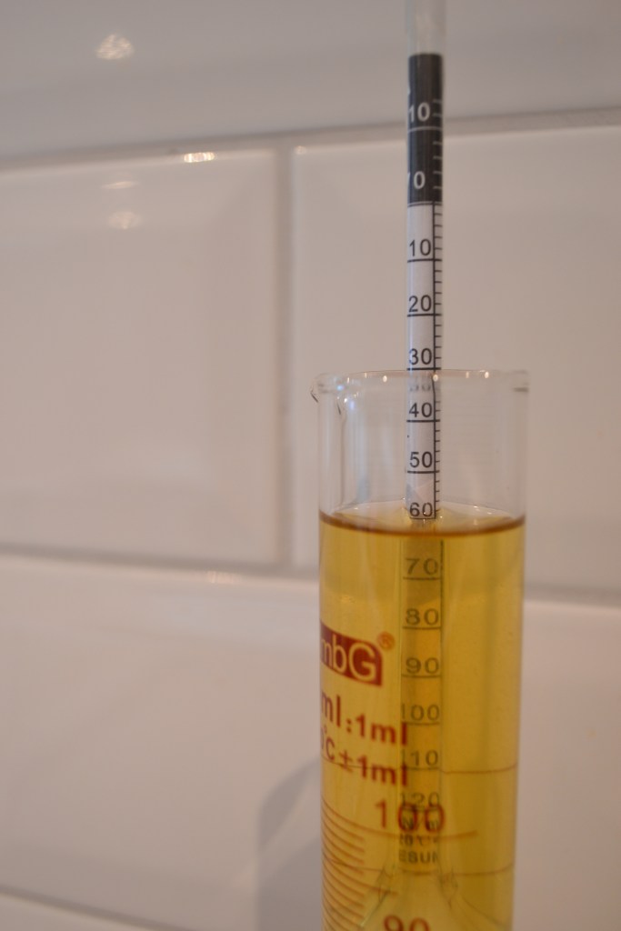 Det kanske börjar bli lite tröttsamt med bilder av hydrometer-avläsningar. Denna är dock tänkt att tjäna ett annat syfte, nämligen att visualisera den klara vörten som jag fick ut.Här är SG innan spädning.