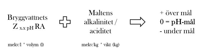 Så långt förhållandevis okomplicerat, värre är det avseende maltens bidrag. Maltens alkalinitet respektive aciditet erhålles enligt följande formel. Ett positivt värde innebär alkalinitet och ett negativt aciditet.
