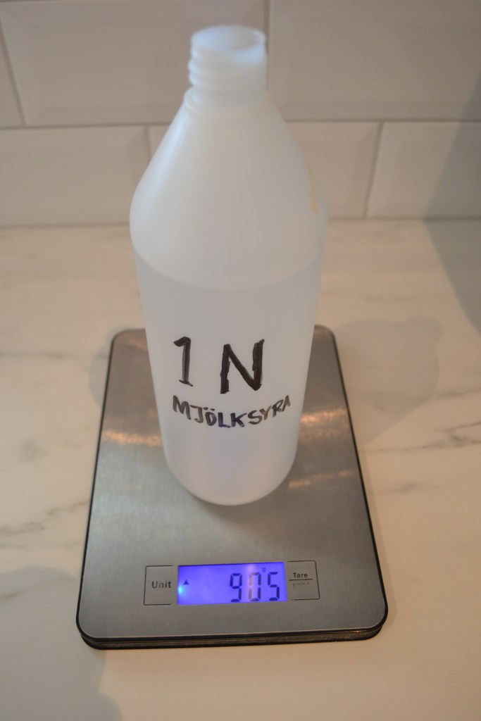 Använd erforderlig skyddsutrustning vid hantering av starka syror och tänk på att alltid tillsätta syra i vatten och inte tvärtom, ”Do what you oughta, add acids to water (watah)”. Börja därför med att mäta eller väga upp 907 ml (1000-97) vatten och tillsätt därefter syran däri. 907 ml vatten väger cirka 905 g, eftersom densiteten hos vatten i rumstemperatur 998 kg/m³. Hela förfarandet dokumenterat i bilder nedan.