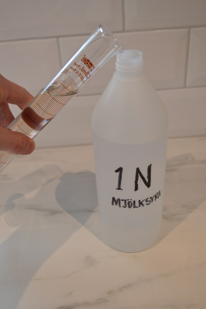 80 är en viktprocent, i vilken syror alltid anges. För att tillreda lösningen behöver molmassan, vikten för den aktuella syran var känd. Mjölksyra (C3H4O(OH)2) har därvid en molmassa på 90,078 g/mol och densiteten ligger på 1,21 g/cm³. Inledningsvis beräknas hur mycket en liter lösning (100%) väger, och det görs genom att densiteten multipliceras med 1000. En liter ren mjölksyra väger således 1210 g. I nästa steg multipliceras denna vikt med aktuell viktprocent och hur mycket löst syra som finns i en liter blir känt: 0,8 * 1210 = 968 g per liter 80-procentig mjölksyra. Därefter avgörs lösningens molaritet (”molarity”) genom att lösningsvikten (968 g) divideras med molmassan (90,078) och en molaritet på 10,746 nås, vilket också är lösningens normalitetsvärde (10,746 N). I det sista steget avgörs hur många milliliter av en sådan lösning som behövs för att istället skapa en 1 N lösning. Det görs enkelt genom att en liter, i milliliter, divideras med lösningens normalitetsvärde. Följaktligen behövs 1000 / 10,746 = ~93 ml mjölksyra av aktuell koncentration för att skapa 1 liter normalitetslösning.