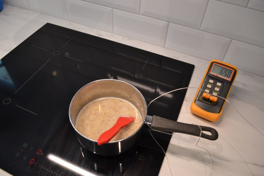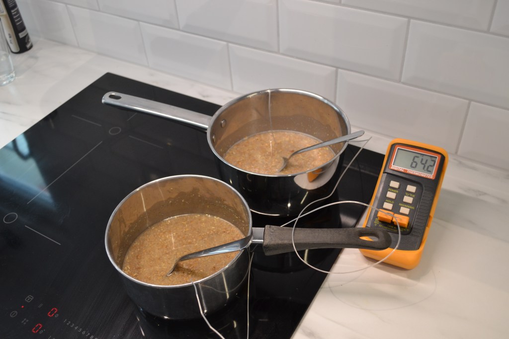 Jag mäskade in vid 60 grader kring 19-tiden på måndagskvällen. Drygt 10 kg malt, varav 2,5% karamellmalt i 36 liter vatten. En ratio på 2,6 liter vatten per kg malt, om man bortser från min ”dead space”, utrymmet under maltkorgen. Därefter 45 minuter i 63 grader, sedan 20 minuter i 70 grader och avslutningsvis utmäskning i 78 grader under ungefär en kvart. Jag tog ett prov för pH-mätning en bit in i försockringsrasten, som landade på tillfredsställande 5,5.