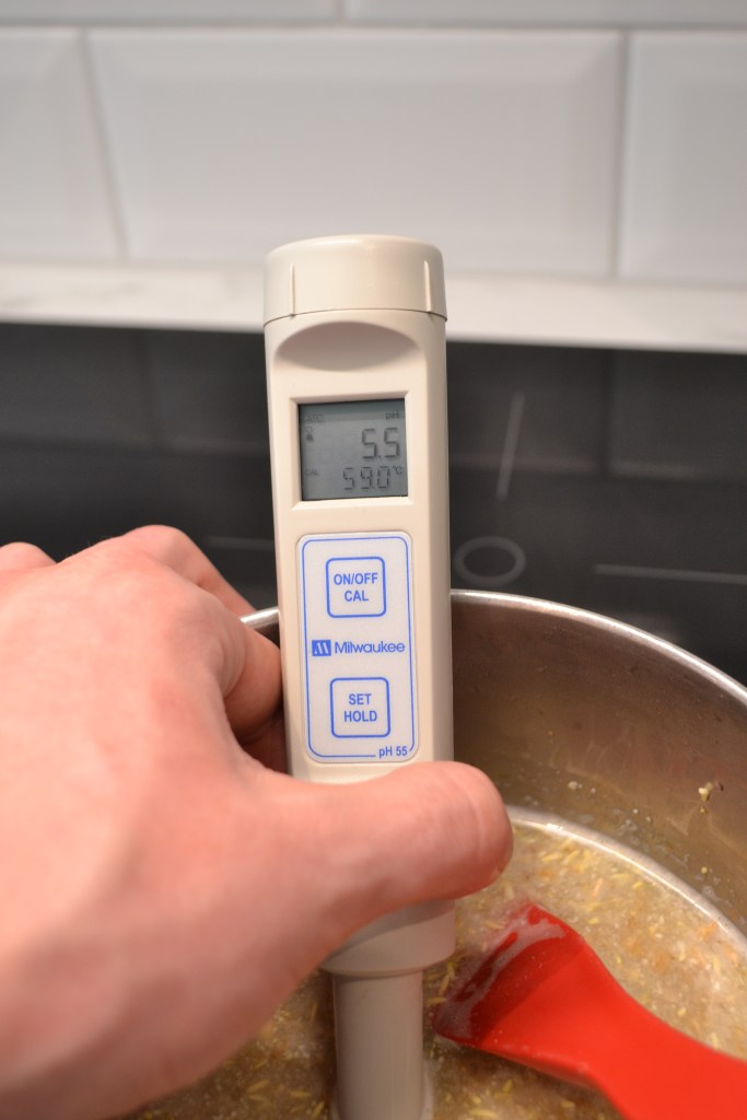 Jag siktade på ett något lägre mäsk-pH denna gång i syfte att förbättra förjäsbarheten. Av samma anledning lät jag också mäsken vara lite tunnare än vanligt.