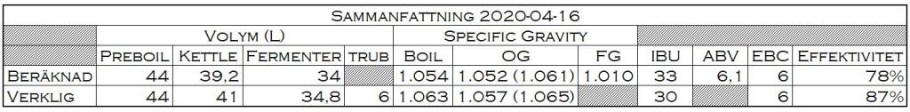 Trots en smärre succé så långt nådde jag inte riktigt beräknad OG, utan endast 1.058 mot förväntade 1.063. Med 34 liter i jäshinken och 6,5 liter kasserad dravblandad vört innebar det en volym om 40,5 liter efter kok. Större än beräknad och följaktligen en möjlig förklaring till den lägre vörtstyrkan.