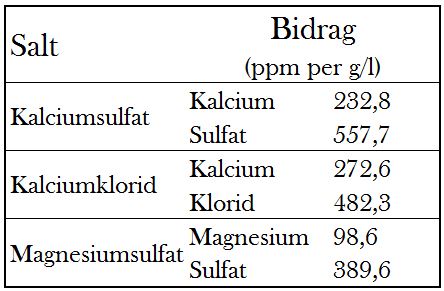 Kalcium 50-150 ppm Magnesium 0-40 ppm Klorid 50-150 ppm Sulfat 50-150 ppm och 150-400 ppm för IPA:or och humledominerade öl.