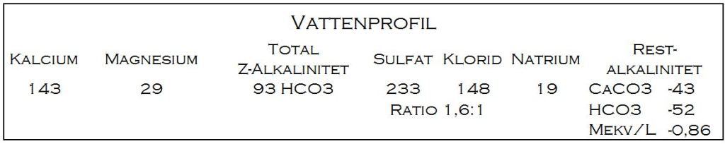 Vattnet justerades även denna gång till profilen härunder. För att nå den lägre rest-alkaniteten till nivå som visas tillsatte jag också 1 ml mjölksyra (80%) i mäskvattnet.