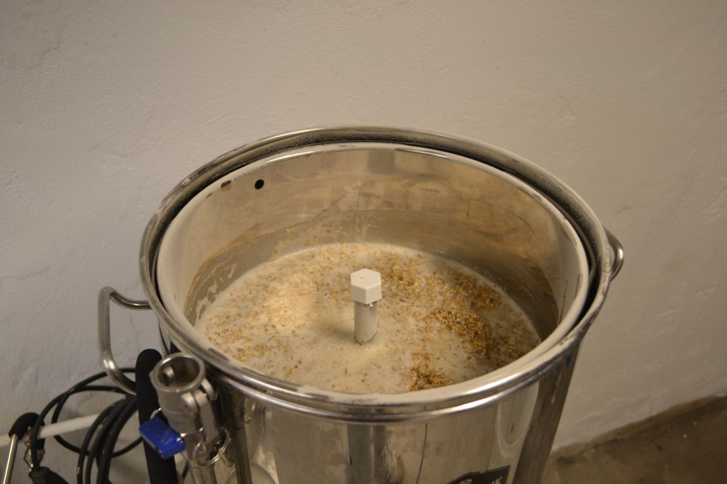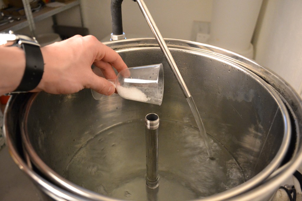 Som brukligt är startade dagen med upptappning av vatten för mäskning. 36 liter hällde jag upp i bryggverket och lät det värmas till 60 grader för inmäsk medan jag vägde upp malt och mätte upp salter för vattenbehandling. Om detta ämne kommer ett separat inlägg inom kort.