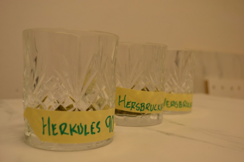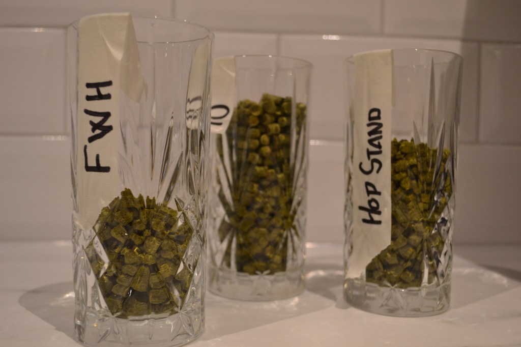 60 och 10-minutersgiva samt Hop stand i en halvtimme vid cirka 75 grader efter kok, 250 gram totalt. Därefter kommer 50 gram gå som torrhumle i ett av faten.