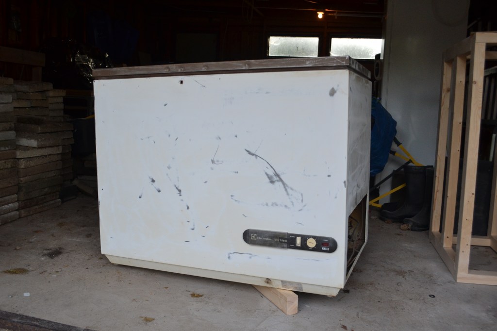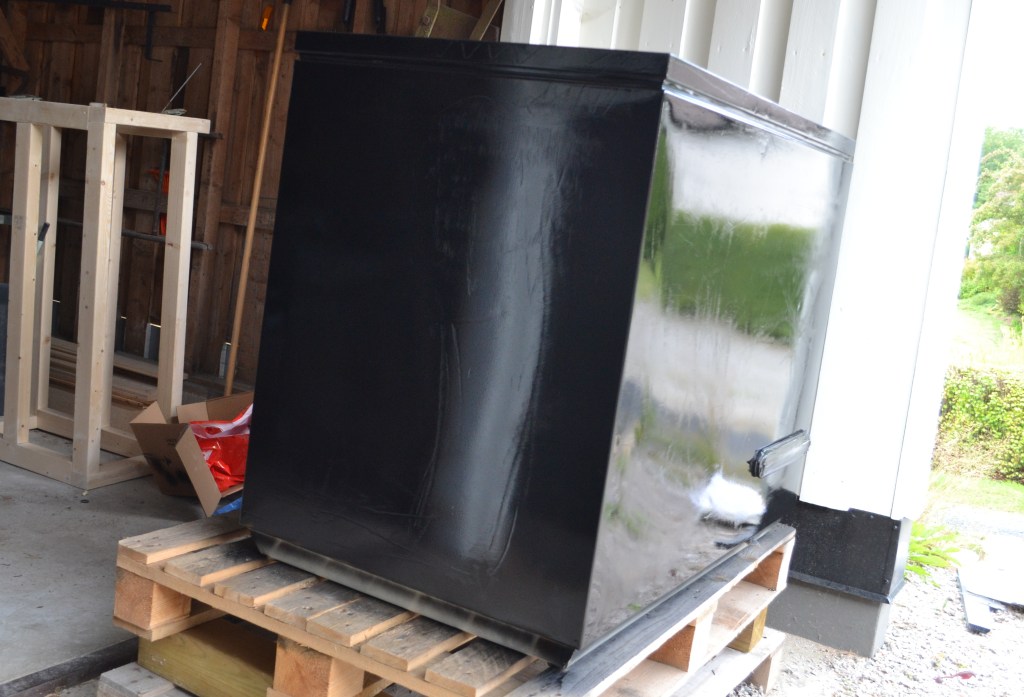 Frysboxen lackerad. Vid mina tidigare byggen har jag spraylackerat (bilden visar detta) men nu sista gången köpte jag faktiskt en annan färg och målade på med en fin roller. Anledningen var att höstkylan hade börjat rulla in och jag ville kunna vara inne och göra det. Resultatet, skulle jag säga, blev faktiskt lika bra, om inte bättre. Locket är rollat med griffelfärg och ett nytt handtag finns monterat på ovansidan.