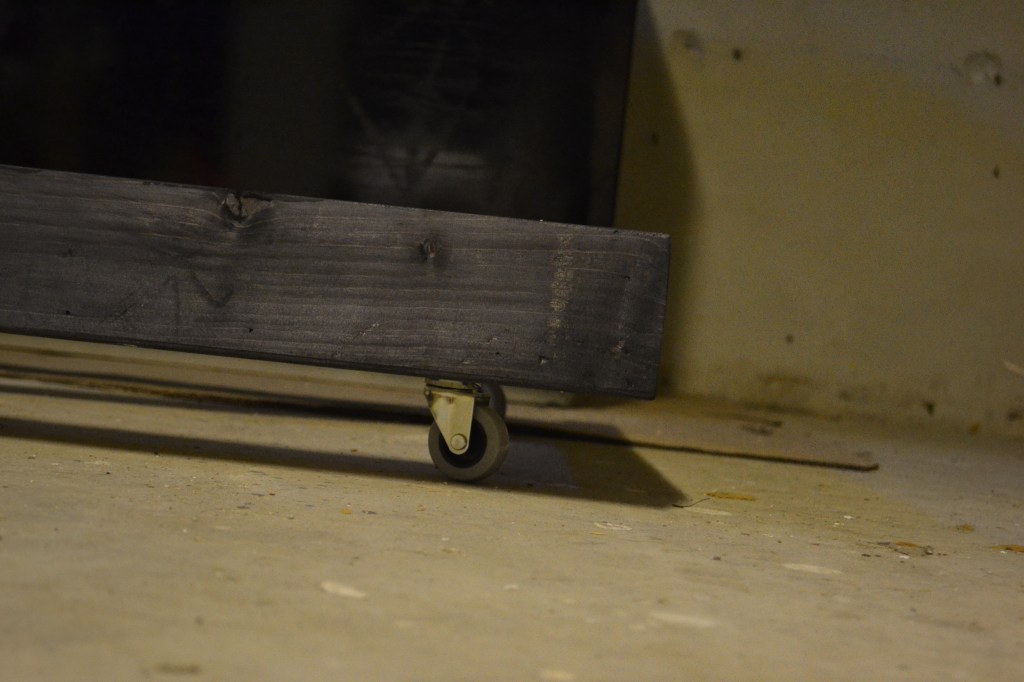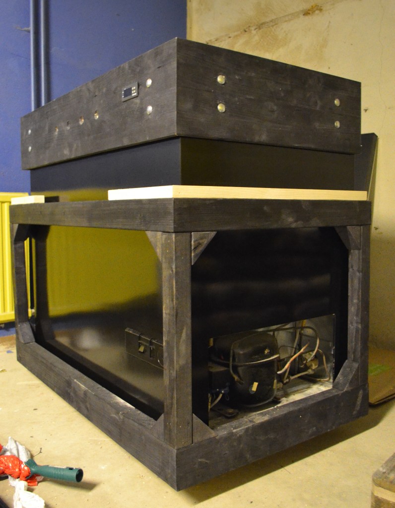 Alla trädetaljer har jag valt att betsa i en grafitsvart nyans. Innan den övre kragen läggs på plats, nedan, är det lämpligt att ta ut hål för kranar och termostat. Ta ut ett lämpligt mått, men sikta mot att centrera kranarna i såväl höjd- som breddled. Beakta dock så att hålen inte hamnar så att de går in i locket eller frysens vägg.