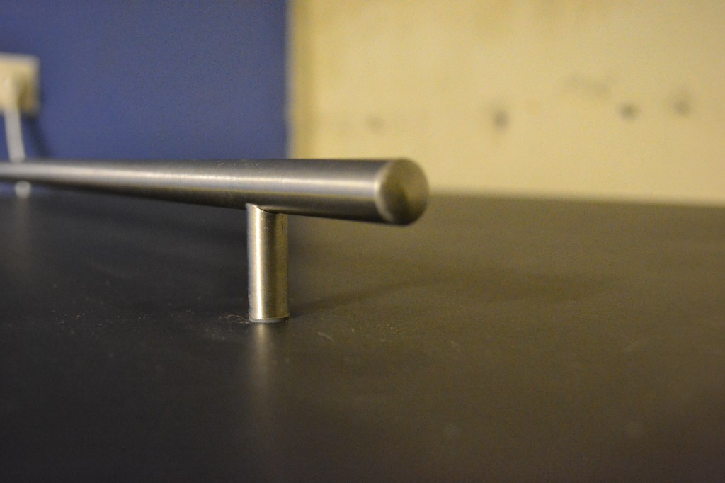 Passa in hyllplanen med lite trälim på innerramen. Personligen föredrar att ha kanten i nivå med locket, vilket i mitt fall lämnade 5 cm av hyllplanet ovanför regeln. Fixera dem på lämpligt sätt före håltagning. Jag använde spikpistol och drog ett antal spikar från insidan. Skruvtvingar fungerar också, det har jag använt mig av tidigare. Mät ut var vagnsbultarna ska sitta, eftersträva att få dem hyfsat centrerade i höjdled. Borra därefter hål i den dimension som används, 8 mm i mitt fall, och fäst vagnsbultarna med bricka och mutter.