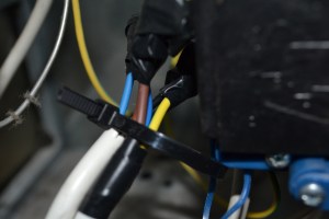 Därefter tog jag en vanlig sladd, 3G1,5, med tre kablar – en brun, blå och gröngul. Den sistnämnda är egentligen jord, men fick agera signal- eller kontrollkabel i mitt fall och bli ”svart”. Jag sammanfogade kablarna med de från kompressorn med hjälp av toppklämmor och drog upp dem till termostaten, där jag kopplade enligt nedan.