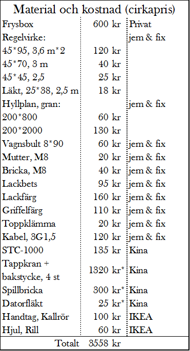 Faktum är att jag har byggt två keezer’s tidigare och detta är min tredje i ordningen. Den första höll i drygt ett år och gick sönder vid en flytt, som i efterhand inte var så varsam som krävdes. Alternativt, eller i kombination, med ett ogenomtänkt tilltag där jag borrade ett antal hål i en av väggarna för infästning av en spillbricka. Jag saknade verkligen koll, pinsamt nog, på hur frysboxar är konstruerade. Troligtvis läckte köldmediet ut vid ett tillfälle och min keezer kylde i vart fall inte längre, trots att kompressorn gick. Samma fel inträffade med mitt andra bygge. Här förelåg dock felet från början, men jag hade missat att göra en fullständig funktionskontroll av frysboxen innan jag påbörjade konverteringen. Lyckligtvis har jag lärt mig något av historien och förutsättningarna var betydligt bättre inför mitt tredje keezerbygge. Nedan syns en ungefärlig inköpslista för denna.