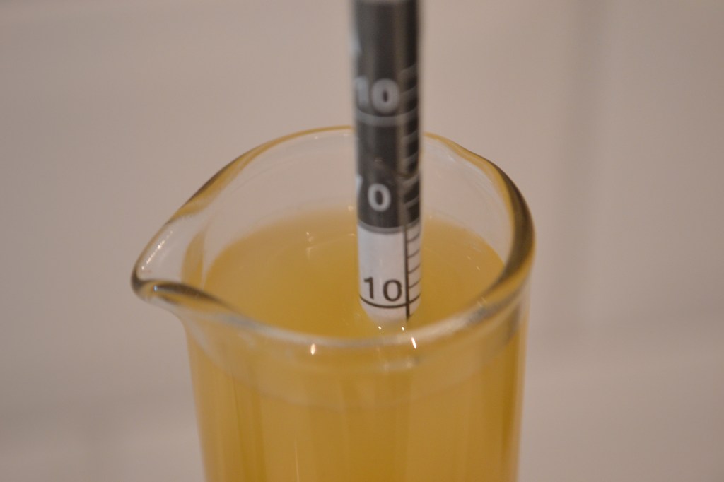Mina hydrometrar stämde väl överens med båda referenspunkterna utan några justeringar. Med dess föregångare tidigare har jag fått göra vissa justeringar. Mätinstrumentet använder Arkimedes princip och värdet är följaktligen beroende av hydrometerns vikt. Det innebär att i de fall då den visar ett för högt värde så väger den för lite och det kan åtgärdas med lite tejp som extra tyngd på toppen. Visar den å andra sidan ett för lågt värde väger den för mycket och får justeras genom att en del av ”glasdroppen” i botten filas bort med en fin fil.