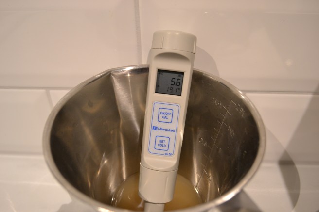 I andra hand började jag tvivla på doseringsmängden av de salter jag tillsatte i mäskvattnet. Stämde uträkningarna för vattenbehandling överhuvudtaget? Jag kom dock fram till att så borde vara fallet, men att jag ändå inte kom ner i pH-värde kanske till följd av de maltsorter jag använt och riktade min uppmärksamhet mot att sänka pH ytterligare med hjälp av syra i mäsken. Härvid ville jag inte bara tillsätta syra, mjölksyra i mitt fall, på måfå och prova mig fram utan sökte efter riktiga formler för exakt uträkning. Jag fann vad jag sökte och räknade på hur mycket jag skulle tillsätta för att komma ner i önskat mäsk-pH.