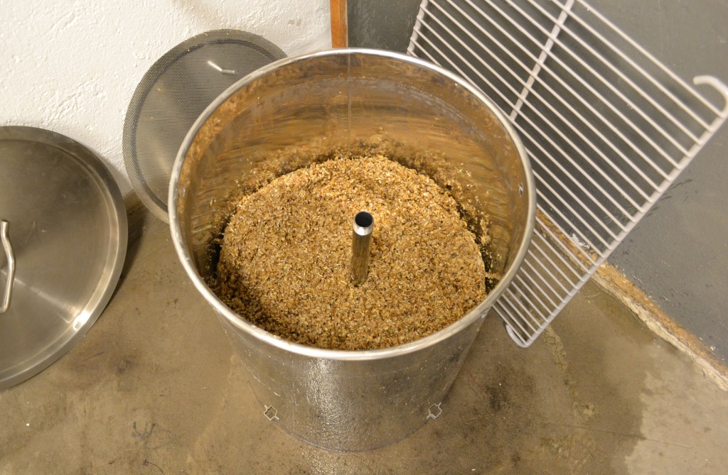 Uppvägningen malten gick snabbt denna gång då det endast var en mindre mängd vetemalt som behövde vägas. Övrig malt kom färdigkrossad i en behändig 10-kilospåse och kunde hällas i direkt. Malten var av samma slag som vid tidigare bryggningar, men krossningen en annan. Det märktes också under mäskprocessen, som flöt på betydligt bättre. Vattnet cirkulerade fint igenom pipan och maltbädden genom hela mäskningen, översvämmningsröret i maltpipans mitt förblev outnyttjat för första gången.
