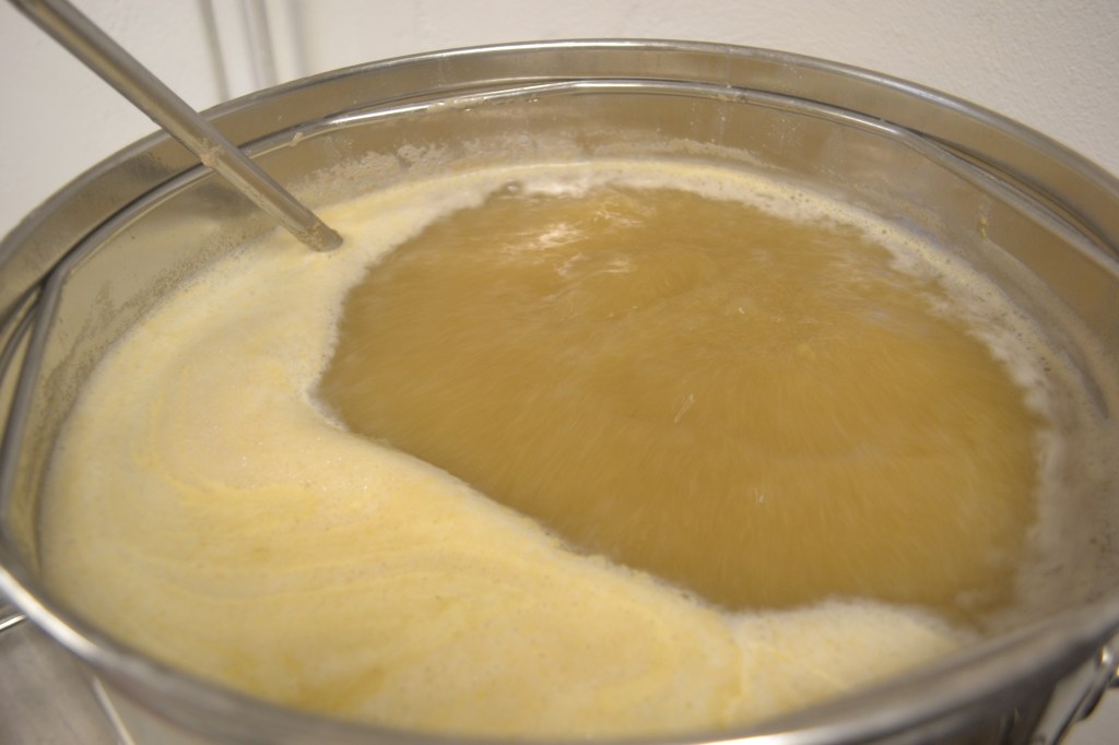 Så som nämnts tidigare upplevde jag vissa problem med min avskiljning av drav efter kok vid denna bryggning. Eller rättare sagt problem med sedimentering av detsamma. Vid min senaste bryggning provade jag för första gången att låta dravet sedimentera innan jag tappade över vörten i jäskärl, förvisso med en viss ”whirpool”. Jag satte ”spinn” i kastrullen direkt efter kylning för att skapa en virvel, vilken, om den utförs rätt, resulterar i att all drav och humlerester samlas i en kon i kokkärlets mitt efter en stunds vila, cirka en halvtimme. Någon kon bildades inte i mitt fall, men sedimenteringen fungerade ändå hyfsat. Visst medföljde lite rester den första litern som tappades upp, men det var bara den del som låg precis framför kranen. Resterande vört var fin, varför jag hade planerat att tappa den första litern i ett kärl bredvid denna gång. Jag gjorde så, men dravet fortsatte att komma genom hela överföringen.