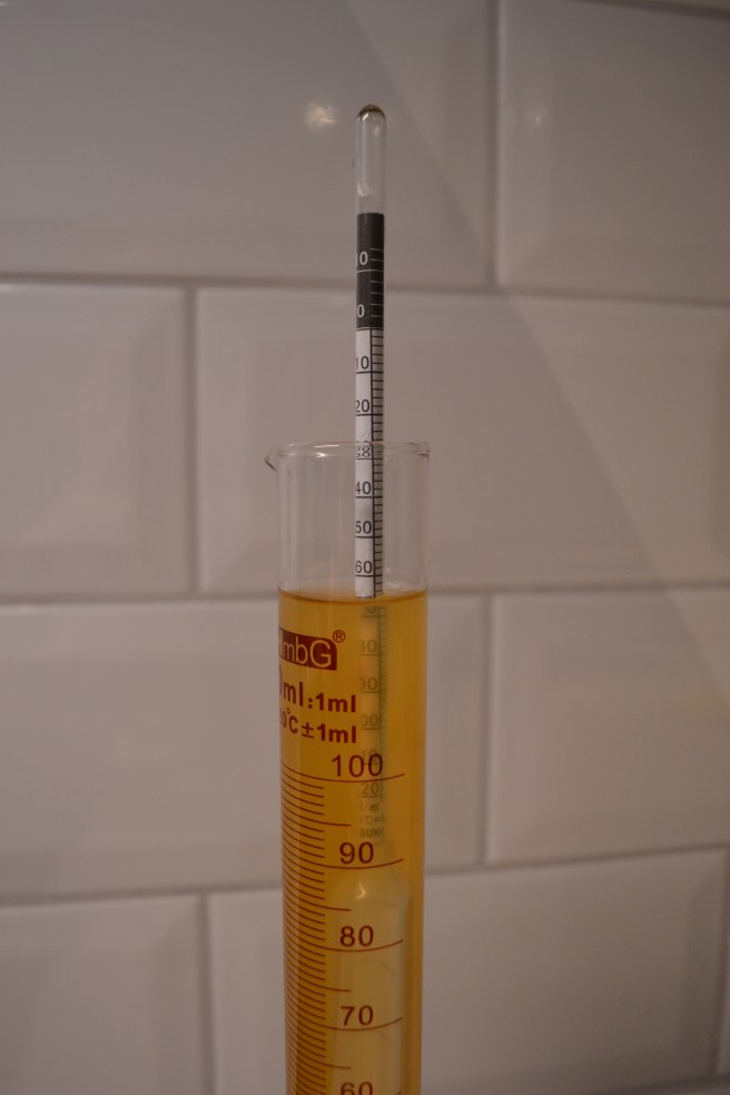 Uppmätt OG var 1.068, vilket innebär att formeln verkligen stämmer ganska bra. Troligt är att formeln i de allra flesta fall stämmer helt och hållet, de två pinnar som skiljer mellan uppmätt och uträknat värde kan sannolikt förklaras av den mänskliga faktorn. I mitt fall, dels vad gäller uppmätning av befintlig volym, vilket jag gör manuellt genom att mäta höjd och omkrets på mitt jäskärl och dels avläsningen av hydrometern.