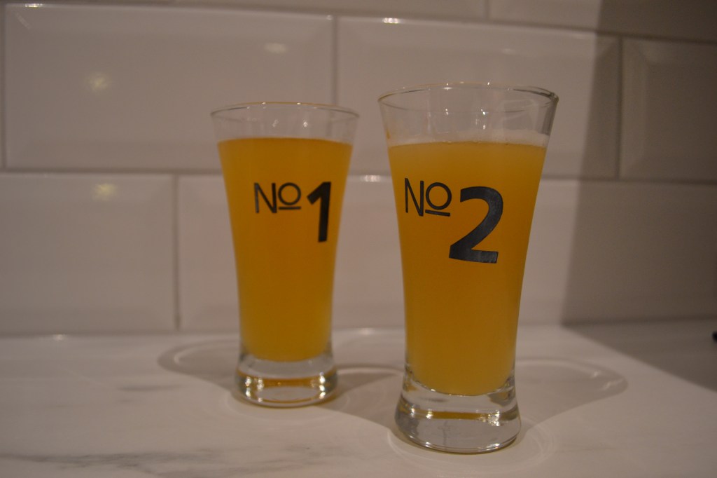 På bilden av ovan syns ett exemplar av den del som torrhumlades och en utan. Som jag nämnde tidigare har skillnaderna i utseende suddats ut och de ser i nuläget exakt likadana ut. Den torrhumlade hade tidigare ett riktigt New England-utseende, men humlejuicen hade ändrat karaktär nu. Båda exemplaren är nu förhållandevis klara, inte som kommersiella öl, men jag vidtog å andra sidan inga särskilda åtgärder för att nå dit. En grym skumstabilitet, troligtvis till följd av vattenbehandlingen och självklart i kombination med en del vetemalt i receptet. Jag har länge använt ungefär 5% vete i min maltkomposition, för i princip alla öl, men aldrig nått ett sådan resultat, varför jag misstänker att det kan tillskrivas vattenbehandlingen. Skummet låg kvar i gott och väl en timme, under hela provsmakningen som jag lät ta lång tid då jag ville ser hur smak och arom förändrades av temperaturökningen. Lagringstemperaturen i keezern ligger på 6 grader, vilket kan vara en något för kall serveringstemperatur för denna typ av ale. Aromintrycken blev starkare efter en liten temperaturuppgång.