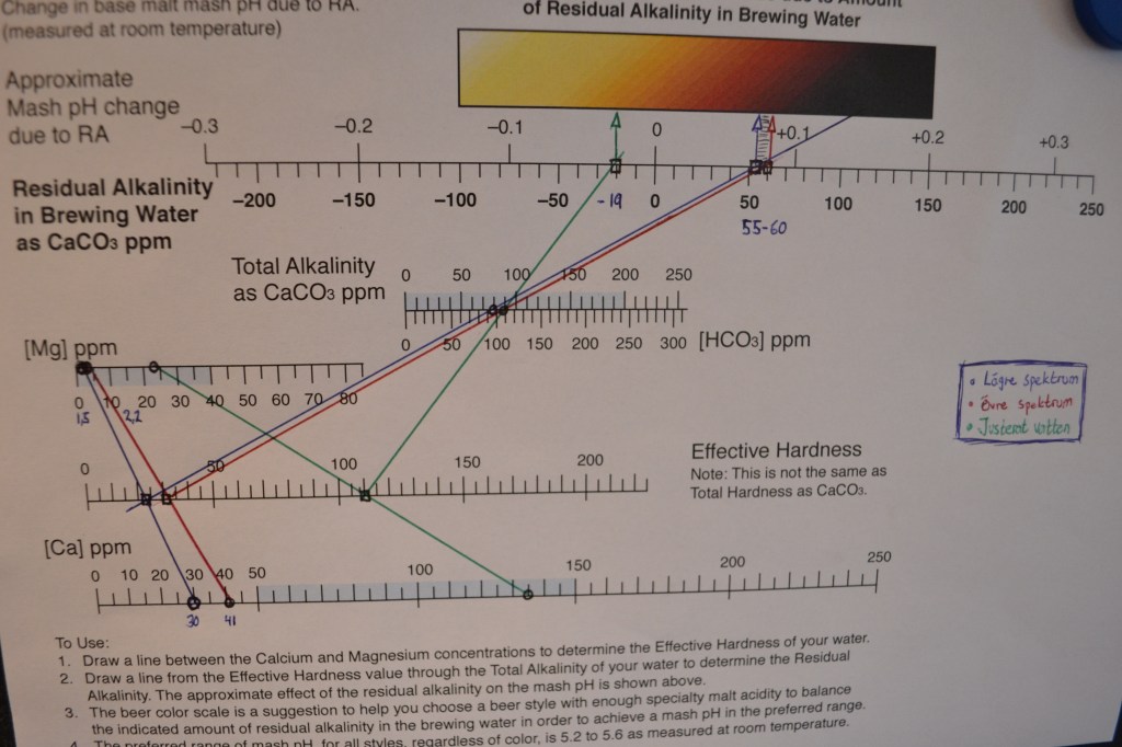 Nomogrammet ger en snabb och översiktlig bild för vattnet, där mitt RA-värde landar på 55-60, röd och blå linje. Den gröna linjen visar även mitt justerade vatten (nedan). Palmer tillhandahåller även excelbaserade kalkylblad för mer exakt uträkning av såväl befintligt vatten som justerat. Det finns såklart bryggprogram som gör detta också.